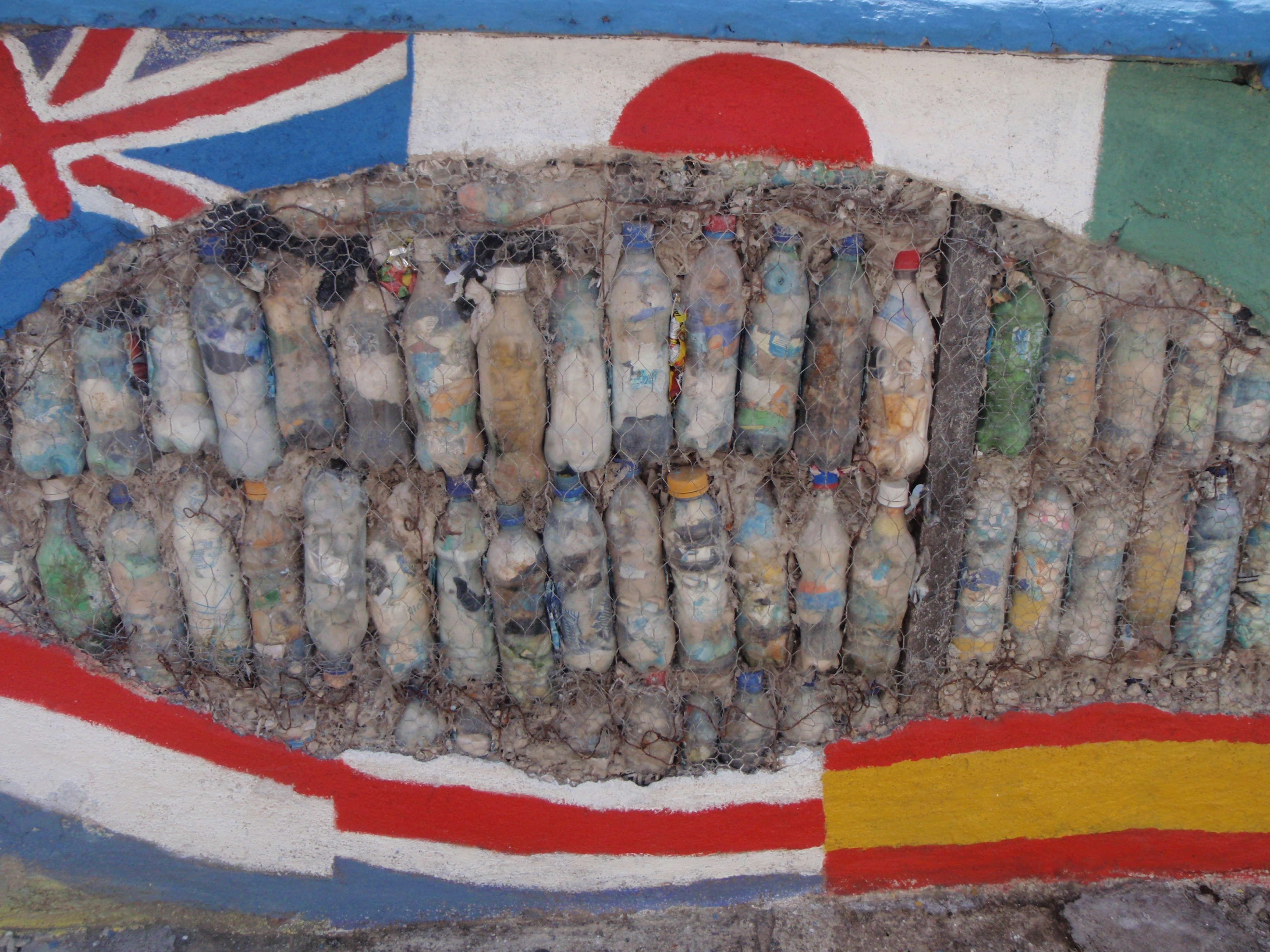 The bottle of trash would be joined with other bottles and become a wall for a home. In more technical terms, the construction technique consists of stacking thousands of bottles between a shelter’s wooden supports, holding them in place with chicken wire, then applying concrete to create what looks like a typical concrete wall.