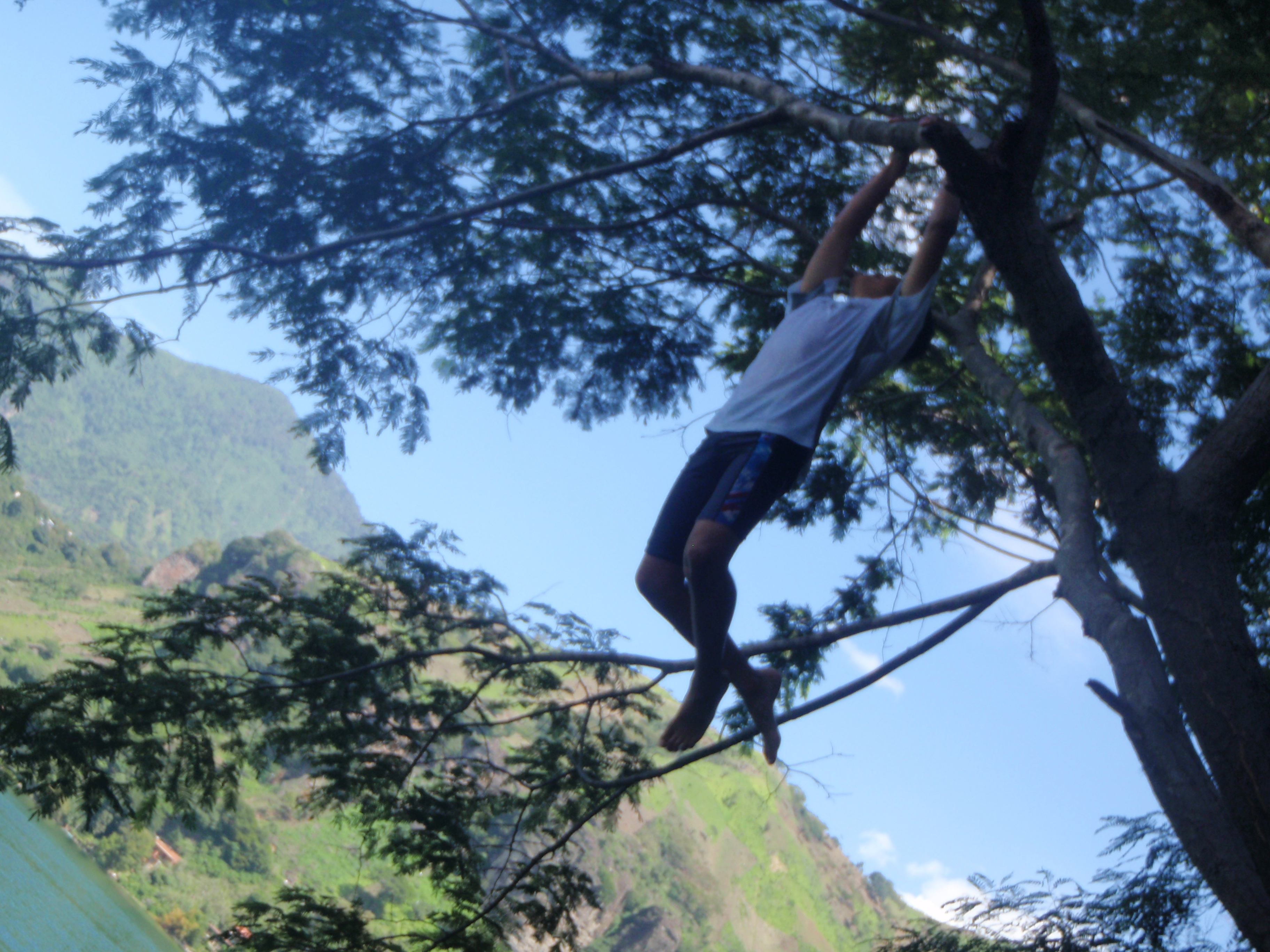 Sometimes all it takes is one. If that first person can make it safely through an adventure, then we figure it will be okay for the rest of us. I wasn’t any stranger to cliff jumping, having jumped and dived off the cliff at Spring Valley dam in Wisconsin when I was a teenager. Still, it was frightening. My heart went up, my body went down and that feeling didn’t dissipate on any of my next jumps. The kids kept telling me to do a pencil dive. I screamed and waved my arms crazily instead. Lee pointed out a tree that hung out over the water to Antonio. Without hesitation, just like at home, Antonio scampered up the trunk, inched out on a limb, and swung off into the water. He did this over and over and over.