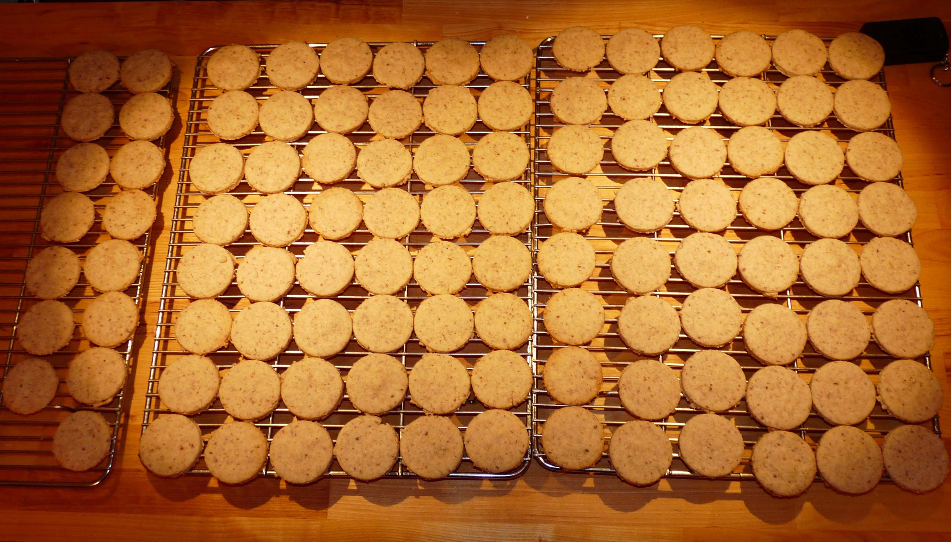 Spitzbuben are sandwich cookies made with ground pecans, butter, flour and sugar. Raspberry jam holds them together. Don’t tell my husband there’s one missing! Quality control.