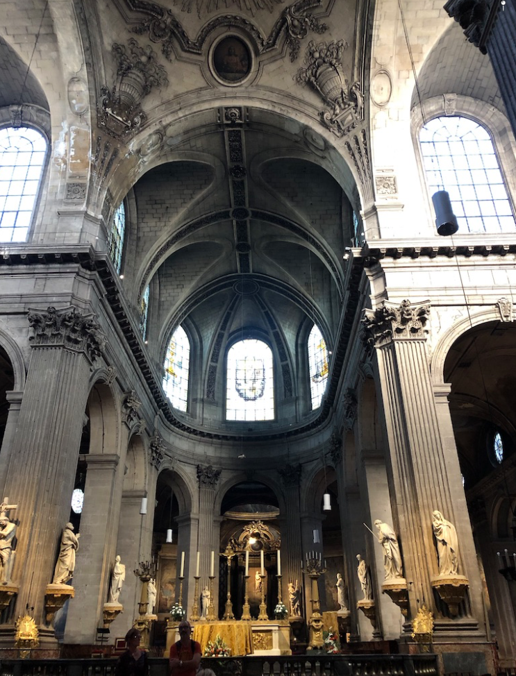 We made brief visits to several neighborhood Catholic churches (my husband loves architecture). Inside were soaring Gothic spaces filled with intricate mosaics and stained glass windows, elaborately carved pulpits and choir stalls, along with altars and candelabra trimmed with gold. Some dated from the 1400’s. Many took several hundred years to complete. Along with the gilt-edged art and stained glass were announcements about parish activities—in other words, these are parish churches, not just historical sites.