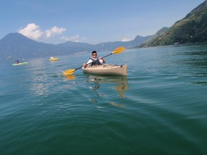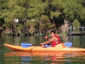 Sam helps us carry our kayaks down to the water. Los Elementos Adventure Center has kayaks that fit the children. All of us are happy that we can each have our own. This is the first time I have ever seen Antonio and Crystel navigate on the water under their own power. They don’t have any hesitancy jumping into their kayaks and pushing off.