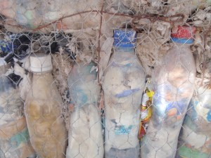 The bottle of trash would be joined with other bottles and become a wall for a home. In more technical terms, the construction technique consists of stacking thousands of bottles between a shelter’s wooden supports, holding them in place with chicken wire, then applying concrete to create what looks like a typical concrete wall.